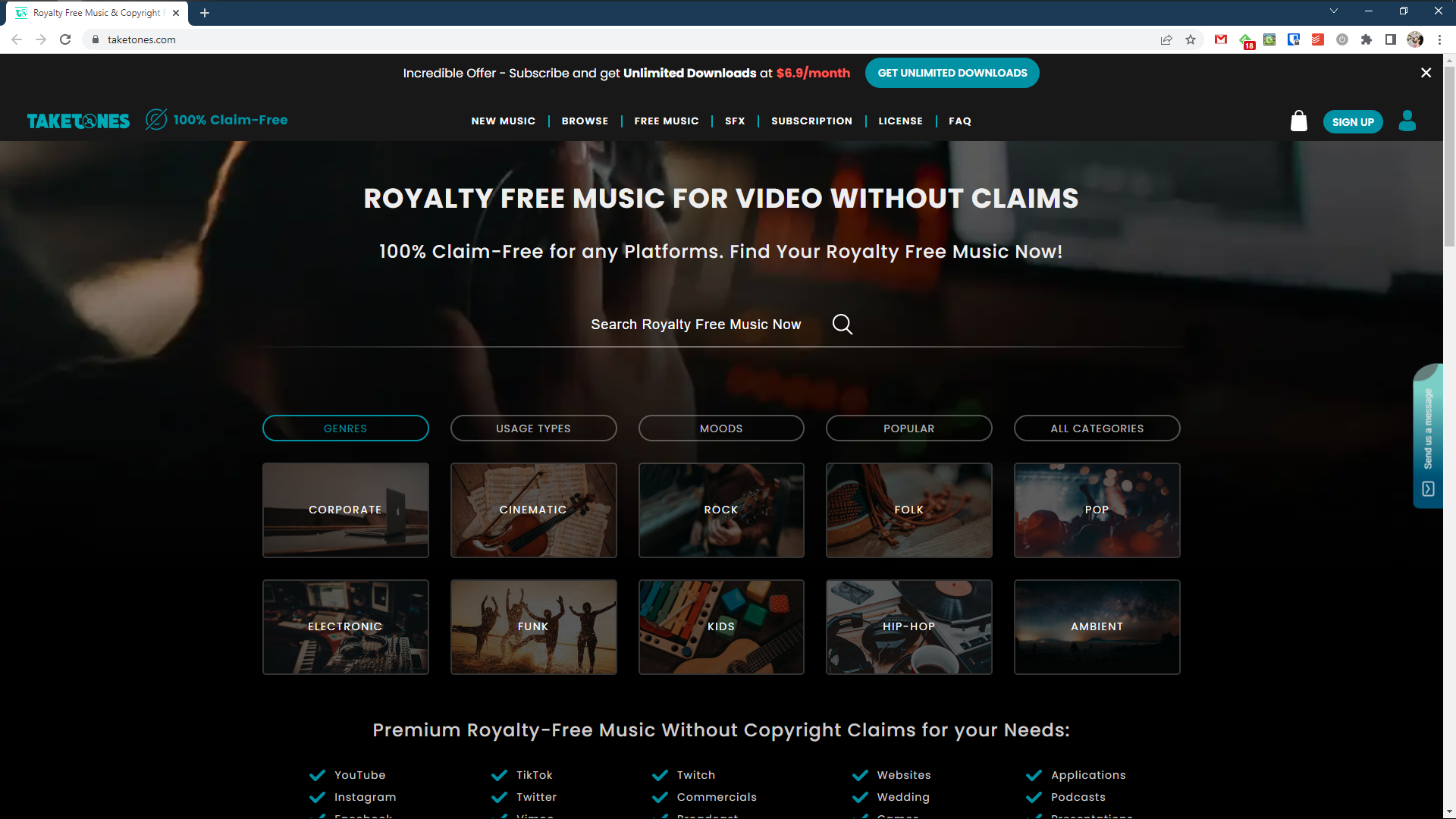 Созданный для того, чтобы вы могли использовать все виды жанров, настроения роялти фри музыки без дополнительной оплаты, TakeTones основан и запущен для служит своей цели с 2014 года. Этот сайт - сокровище для всех тех, кто знает, как важна фоновая музыка в видео.