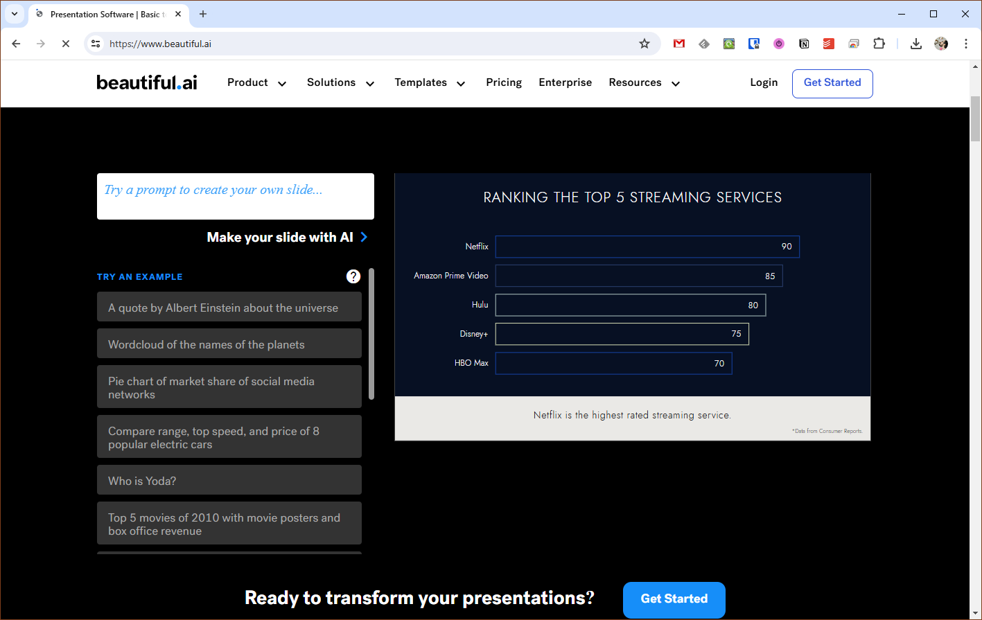 Сервис для создания красивых презентаций. Просто вводите описание той презентации, которую хотите получить, и бот автоматически создаст вам её. Также можно вручную всё сделать самому, выбрав фон, шрифт текста и прочие штуки для своей презентации. Подходит как для одиночек, так и для командной работы.