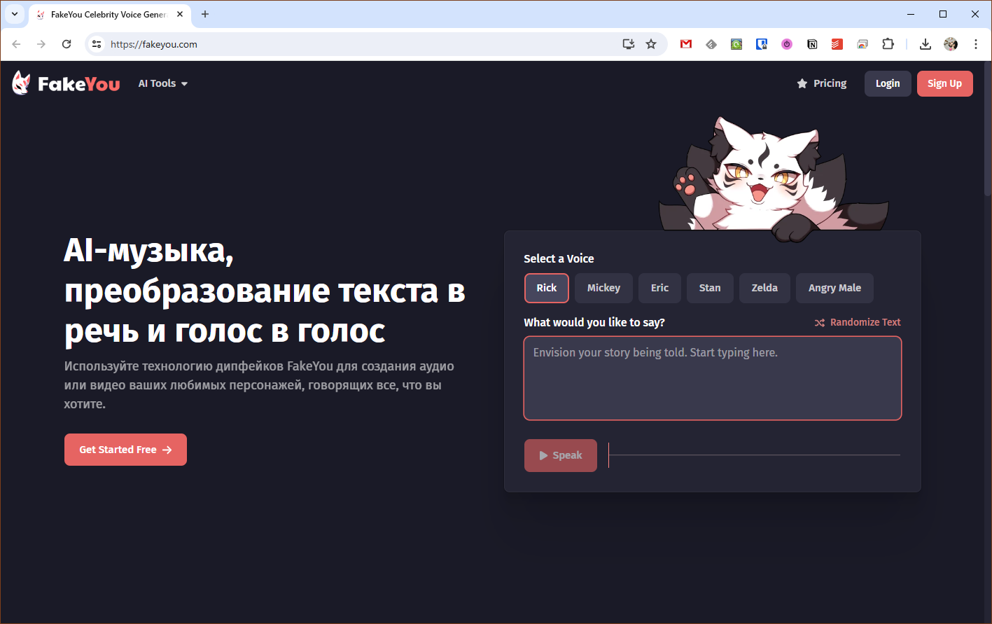Позволяет создавать фейковые аудио и видео. Вы можете преобразовать текст в речь и выбрать голос персонажа (есть Барак Обама, королева Елизавета, Дарт Вейдер и другие), либо можете сразу преобразовать свой голос, загрузив аудиофайл или записав его через микрофон.