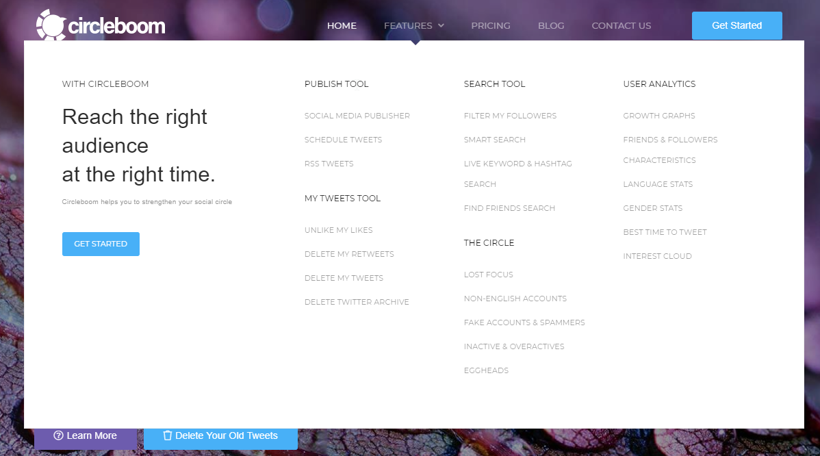 Circleboom — самый всеобъемлющий инструмент Twitter из тех, что вам могут когда-либо понадобиться. Этот инструмент предлагает все функции для: управления вашими подписчиками в Twitter; поиска неактивных профилей; удаления ваших ретвитов; поиска и удаления наиболее «разговорчивых» подписчиков.