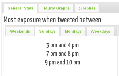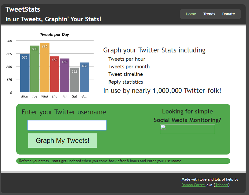 Отслеживание использования Твиттера — отличный способ подстроиться под социальную сеть. TweetStats — это великолепный бесплатный инструмент для анализа статистики ваших твитов. Вы увидите количество публикуемых и читаемых твитов в день и в месяц с распределением по часам и дням недели.