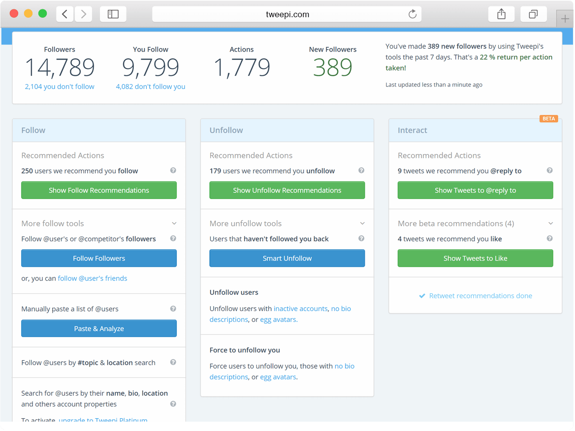 Что если однажды вы заметите, что большинство пользователей Twitter, за которыми вы следите, давно не проявляют никакой активности? Tweepi позволяет вам наводить порядок в Твиттере, время от времени убирая неактивных пользователей. Tweepi также помогает вам находить пользователей, чьи интересы совпадают с вашими.