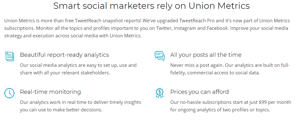TweetReach — отличный инструмент для профессионалов в области маркетинга и PR. Данное приложение позволяет узнать истинный охват аудитории. С помощью TweetReach вы можете увидеть, как далеко распространяется ваше сообщение. Цены на TweetReach начинаются с 84 $ / месяц. Нельзя сказать, что это дорого, ведь это инструмент для серьёзных профессионалов.