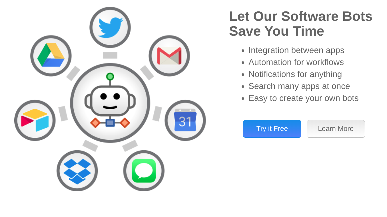 zzBots — платформа, которая тоже интегрируется в процессы и автоматизирует: синхронизацию между приложениями — видеть всё можно из одного места; отправку уведомлений из других приложений; общение; сбор данных и т.д. Есть удобный поиск по всем приложениям сразу, есть возможность создавать своих ботов. Есть чат для команды и свои приложения для разных платформ. 10 пользователей и 50 ботов в месяц по 100 долларов.