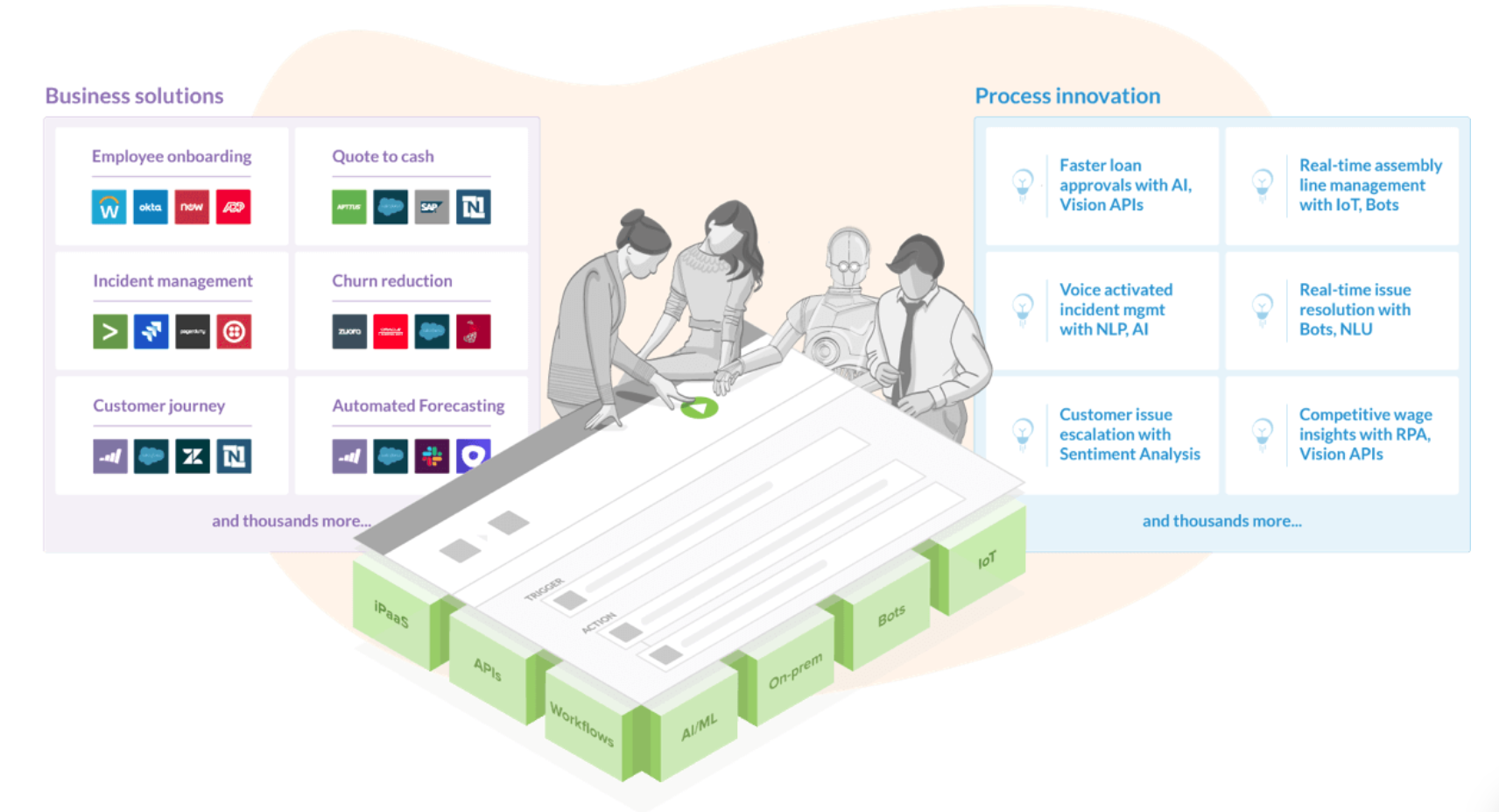 Salesforce, iPaaS, SaaS, API, большие данные, большая корпорация с большим клиентооборотом — всё это сможет сделать Boomi. Серьёзный сервис для серьёзных компаний. Стоит недёшево. Автоматизирует воронку клиентов, документооборот. Можно настроить под себя.