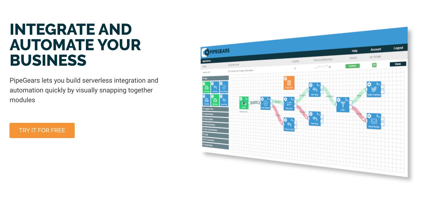 PipeGears предоставляет несколько уникальных функций. Например, возможность создавать конечные точки WebSocket, которые обеспечивают двустороннюю связь в реальном времени, или планировщик cron в стиле UNIX для запуска задач в определённое время. Его можно использовать для автоматизации и интеграции, или для создания отдельных API-микросервисов, которые могут обрабатывать большие объёмы клиентского трафика. Объединяет базы данных MySQL, MS SQL, PostgreSQL, MongoDB. Чтобы всё это заполучить, придётся платить до 380 долларов в месяц.