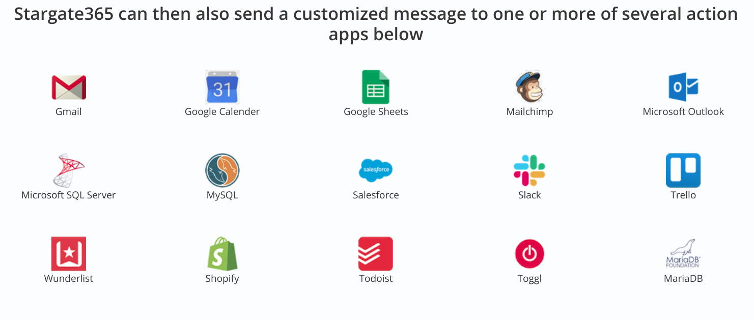 Данные могут поступать из многих приложений, таких как Gmail, Microsoft Outlook, рекламные объявления Facebook, Shopify, большинство онлайн-приложений. Сервис умеет отправлять эти данные в такие приложения, как Slack, Wunderlist, Google Sheets, SalesForce, Gmail, MySQL, MS SQL Server и другие. Stargate365 умеет автоматически обнаруживать и анализировать тысячи различных электронных писем из Gmail, Outlook, Amazon, Shopify, MailChimp, PayPal, Typeform и т.д. Не понравилось, что обделили Gmail — там обработка данных раз в 5 минут, тогда как из Outlook постоянно. Но цена не такая запредельная: 5-7 долларов в месяц.