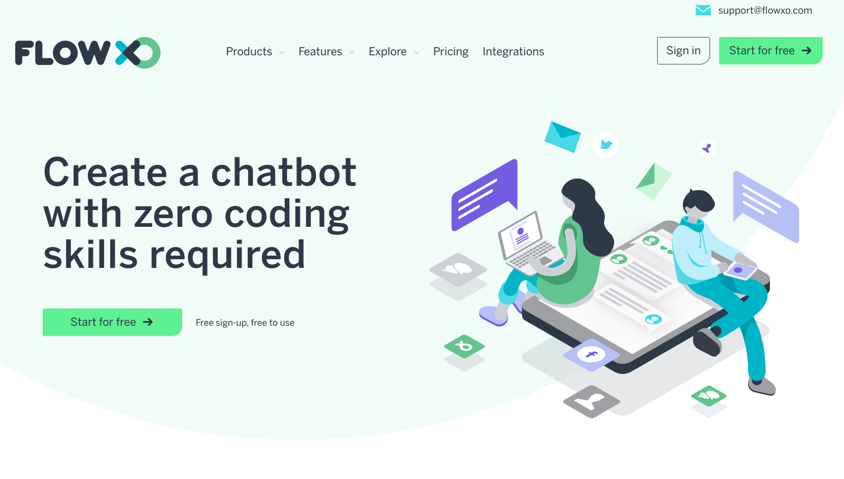 Flow XO позволяет легко создавать чат-ботов, которые помогут лучше общаться и взаимодействовать с клиентами. Причём различными способами. Причём боты даже могут проводить несложные продажи, платежи. Две недели триала с 5 ботами, чтобы вы попробовали, что это такое. Интегрируется в ваши чаты с клиентами, как внутренние, так и в приложениях соцсетей, например. Недорогой. Нет приложений под смартфоны (нужны?). Прекрасная техподдержка.