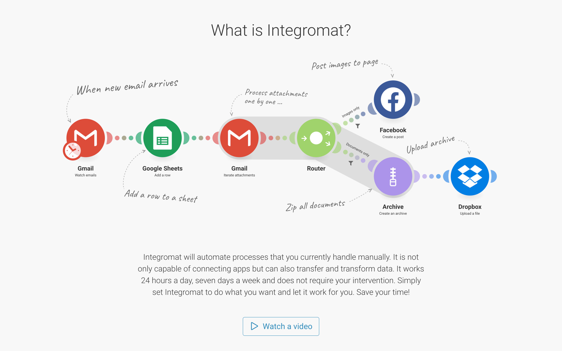 Automate.io профессионально соединяет облачные бизнес-сервисы. Можно автоматизировать таким образом маркетинг, платежи, любые другие бизнес-процессы за считанные минуты. Тут вы найдёте все популярные приложения для CRM, маркетинга, электронной коммерции, служб поддержки, платежей, веб-форм, совместной работы. И многое другое: Gmail, Google Drive, PayPal, соцсети и так далее.