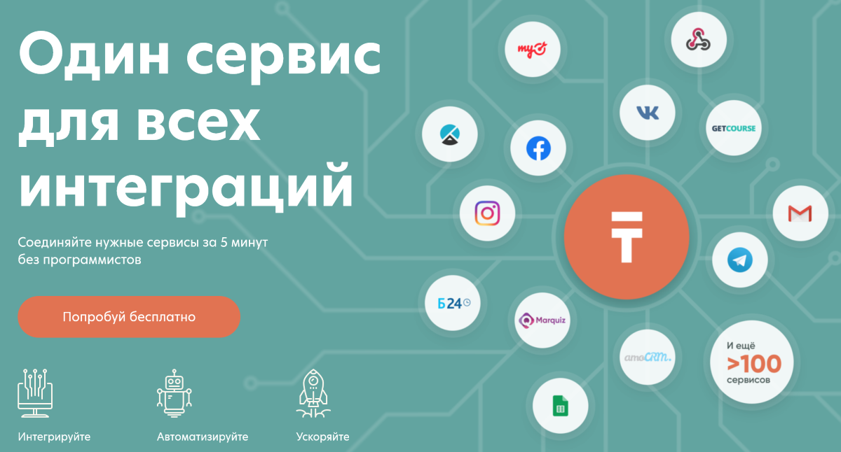 Русскоязычный сервис для интеграции популярных онлайн сервисов, которых здесь более 100 штук. Многим понравится возможность поговорить с русской техподдержкой и низкая цена в 990 рублей.