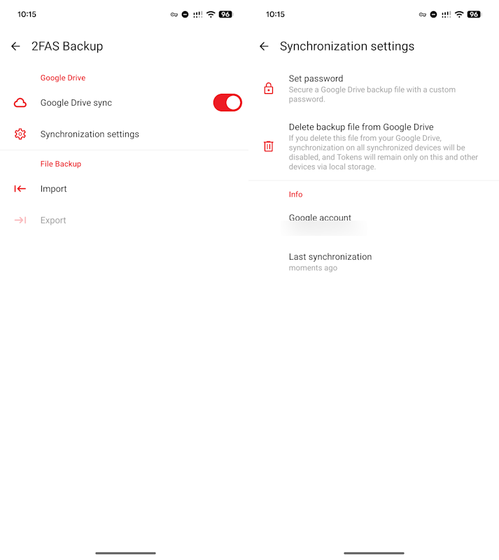 При первом запуске приложения вам будет предложено настроить резервное копирование ключей в Google Drive. И по умолчанию копия создаётся без пароля, его можно добавить отдельно в настройках синхронизации.