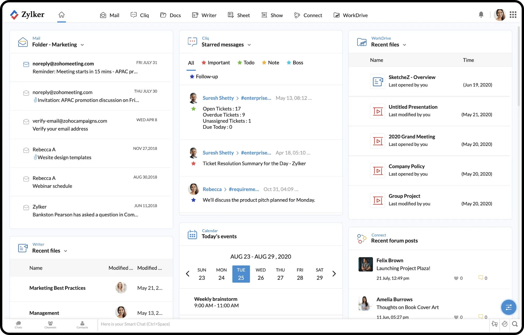 Пожалуй, это самый лучший вариант на сегодняшний день. Zoho предлагает практически идентичный набор инструментов, как и в Google Workspace. Вы можете подключить собственный почтовый домен, хранить файлы, использовать различные встроенные приложения и многое другое.