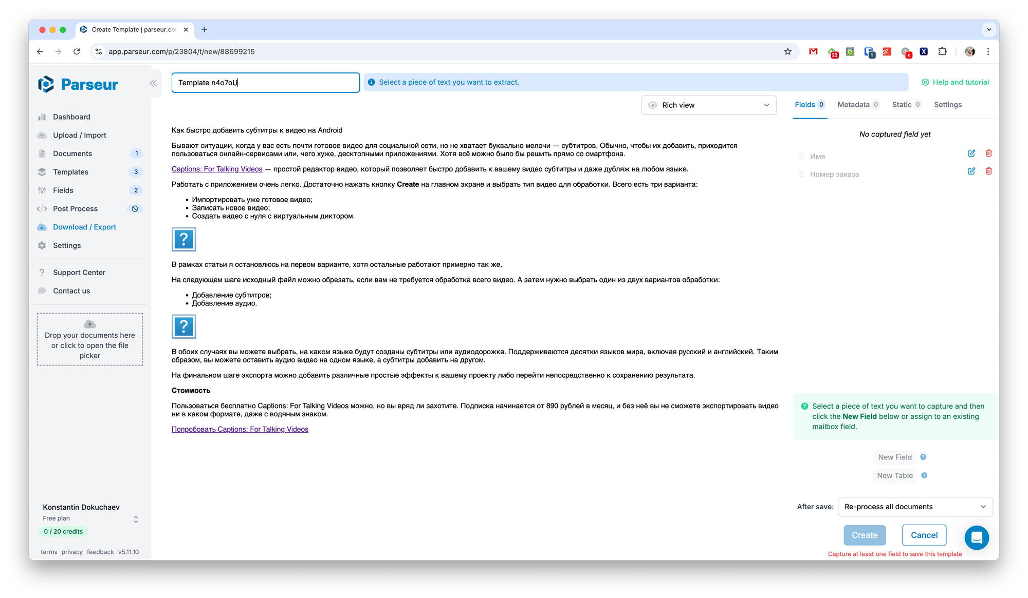 Круто, что при настройке парсера можно указать, какие языки используются в документе (есть русский), а также выбрать, есть ли таблицы, чекбоксы или рукописный текст. Правда, из-за этого придётся повозиться с настройкой полей, что немного замедляет процесс, особенно при первом использовании сервиса.