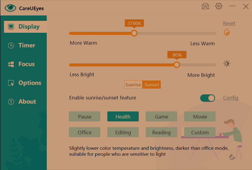 В отличие от других, имеет уже настроенные режимы для разного рода деятельности. Например, при просмотре фильма можете нажать «Movie», и программа автоматически прокрутит яркость экрана на максимум и минимизирует тёплый свет. И так далее. Примечательно ещё то, что программа имеет встроенный таймер и режим «focus», которые могут быть незаменимы в моменты, когда хочется работать, не отвлекаясь. Минус — программа платная (если хотите пользоваться расширенными функциями). Базово дают только включение и настройку вручную.