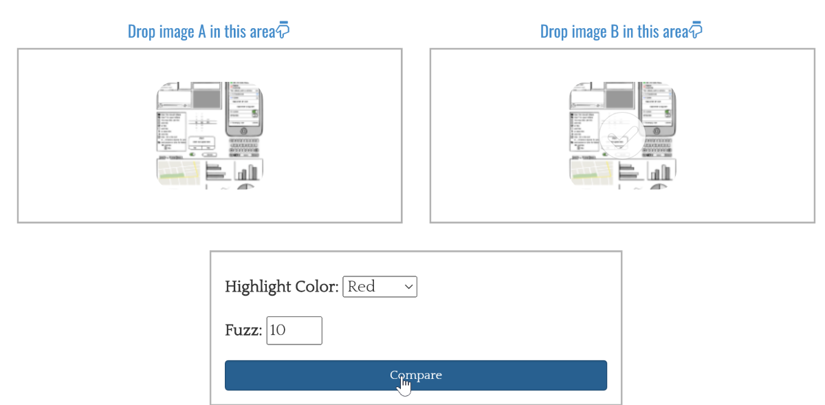 На этом сайте можно найти множество инструментов для работы с изображениями, включая сравнение. Вам нужно загрузить файлы, после чего вы сможете скачать картинку с подсвеченными различиями.