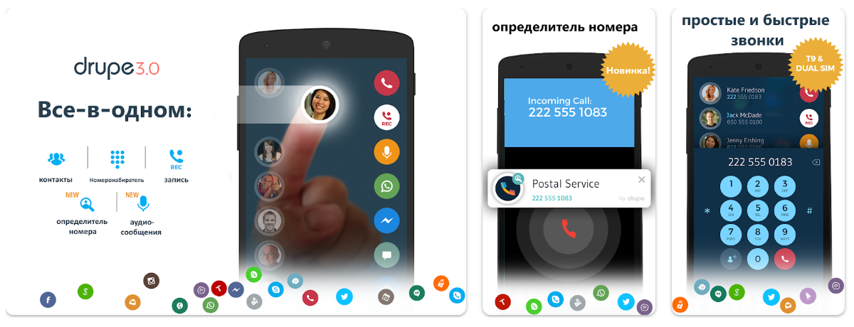 Одна из самых популярных звонилок с красивым современным дизайном, записью звонков, умным набирателем, блокировщиком звонков и возможностью очистить дубликаты контактов. Во время звонка можно обмениваться гифками, если ваш собеседник тоже использует Drupe.