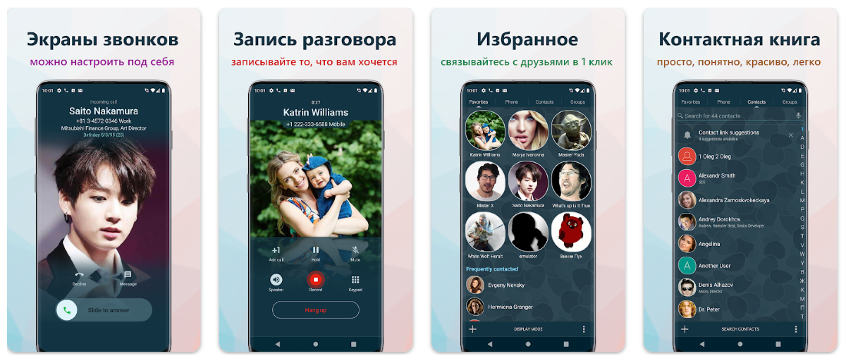 Приложение с крутым дизайном и отличными возможностями. При приёме звонка на весь экран отображается фото собеседника, а внешний вид приложения можно настроить под дизайн вашего лаунчера. К контактам можно добавлять различную информацию.