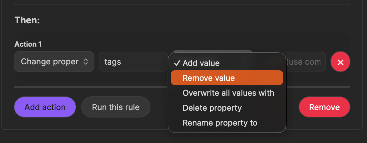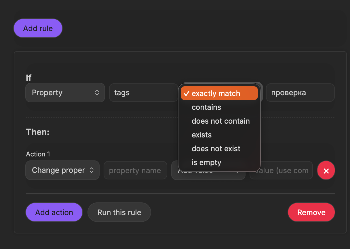 В настройках плагина нужно создать правило, на которое оно будет реагировать. Это может быть часть метаданных заметки (заголовок, тег, дата создания и прочее) или только её заголовок. Например, ниже я задал правило: если тег заметки полностью совпадает со словом «проверка», то нужно выполнить действие.