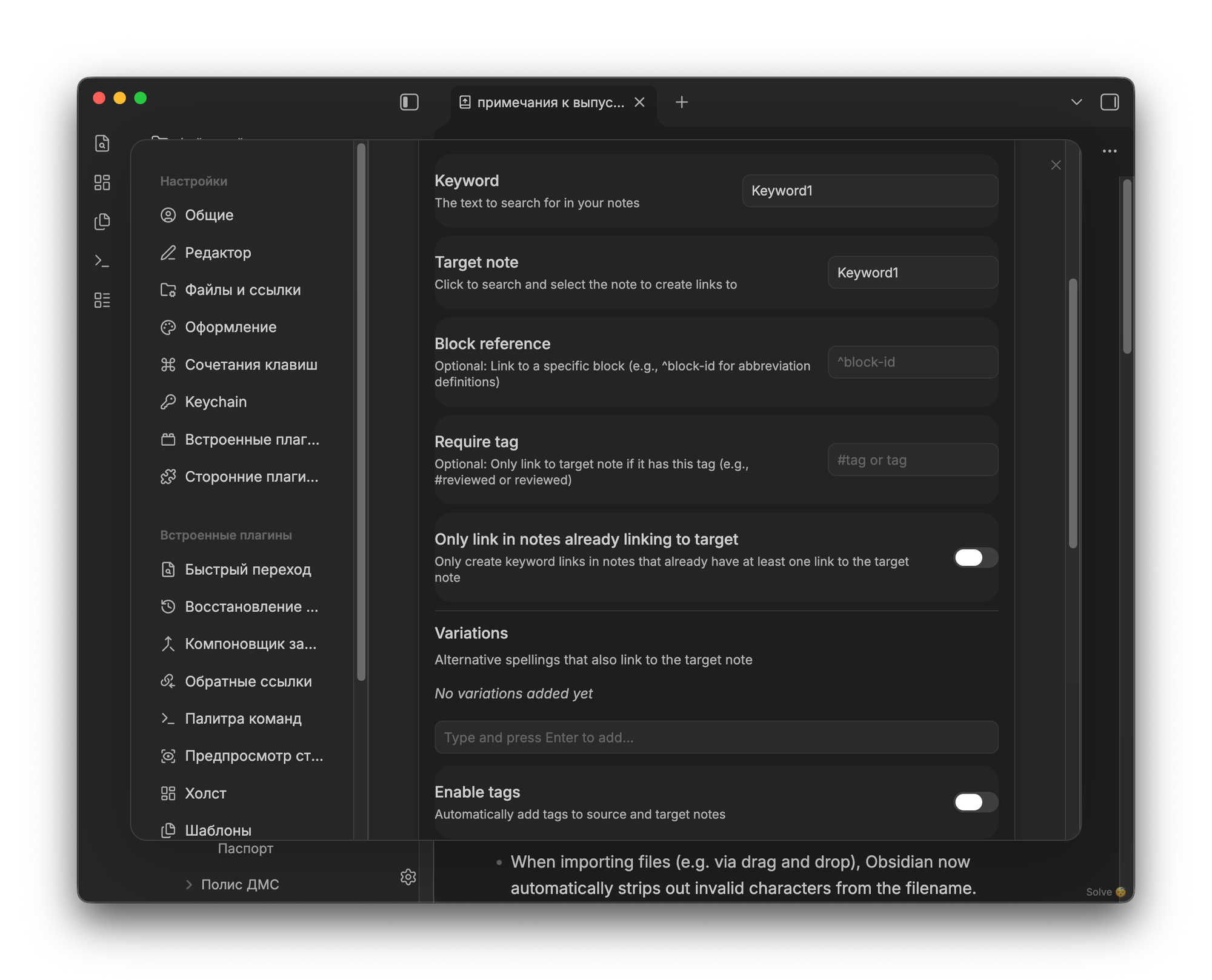 Для этого в настройках нужно указать ключевое слово, по которому будут связываться заметки. Плагин будет искать его внутри заметки и добавлять в него ссылку.