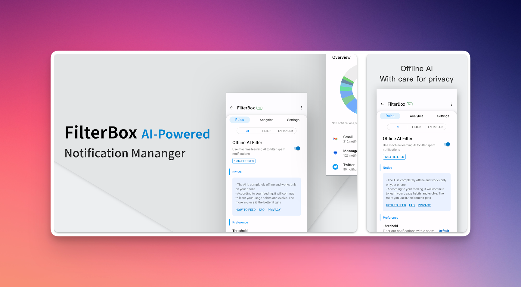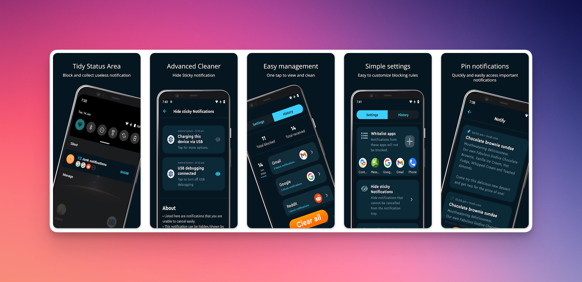 Это мощный управлятор оповещениями, который позволит уменьшить их количество в единицу времени. С помощью настраиваемых фильтров и правил вы сможете приоритизировать важные оповещения и скрыть все остальные. Среди действий доступно: отклонить, выключить звук, отложить или поменять звук оповещения. А для фильтров доступно: приложение, ключевое слово, контакт или время дня.