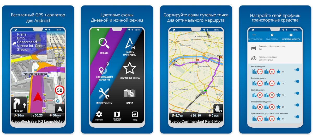 Есть поддержка голосовой навигации, построения маршрута, оповещений о превышении скорости и данные о пробках.