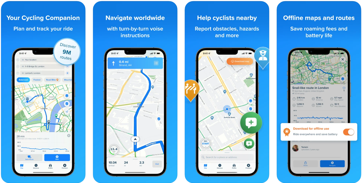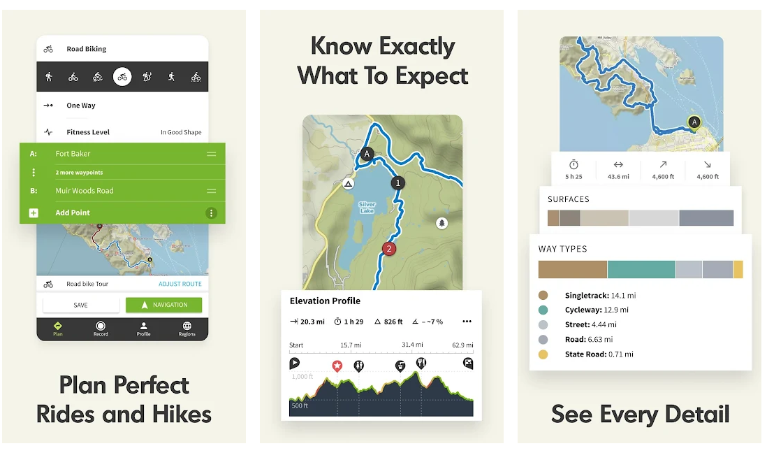 Это приложение использует популярные карты OpenStreetMap и даёт возможность строить не только веломаршруты, но и маршруты для автопутешествий, походов и многого другого. Как и в случае с Google Maps, вам нужно выбрать точку отправки и точку назначения, а Komoot предложит подходящие варианты маршрутов. При этом вы увидите, насколько маршрут сложный, точки перепада высот и многое другое.