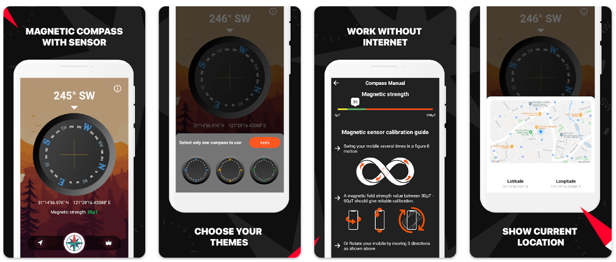 Точный цифровой компас, который отображает стороны света, пеленг, азимут и градус. Но если смартфон не поддерживает акселератор и магнитометр, то приложение не будет работать.