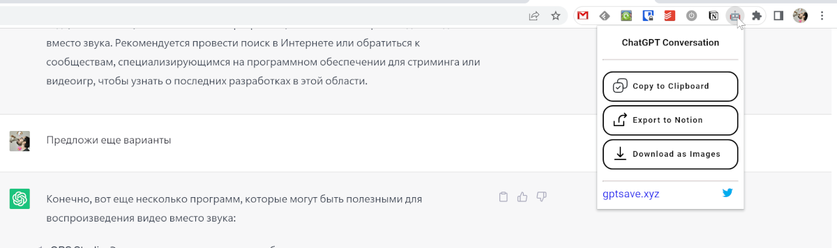 После того как ты порешал с ChatGPT какие-то вопросики, иногда хочется сделать нотариально заверенный экспорт вашей переписки. Для этого отлично подойдёт одно из этих расширений.