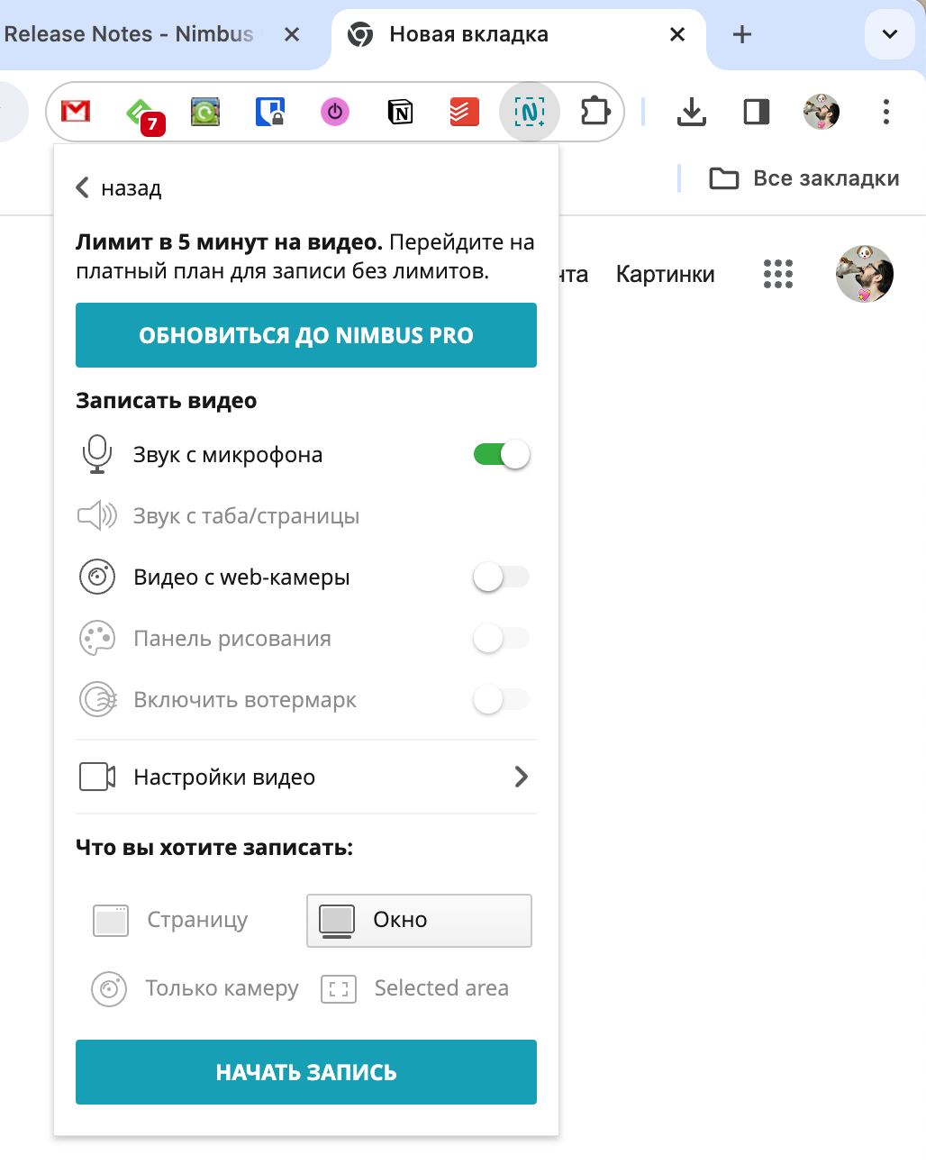 Если вам хочется что-то на уровне Nimbus, но не Nimbus, попробуйте это расширение. Правда, на бесплатном тарифе запись ограничена пятью минутами.