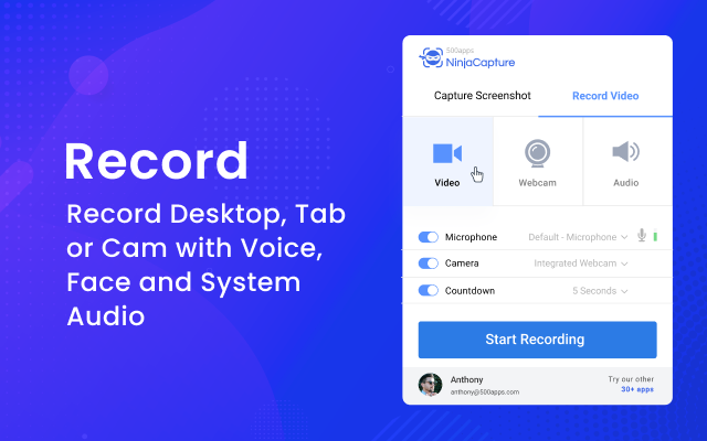 Это расширение сохраняет запись в формате GIF и HD-видео. При необходимости можно захватить аудио или селфи. Поддерживается запись всего рабочего стола и текущей вкладки браузера.