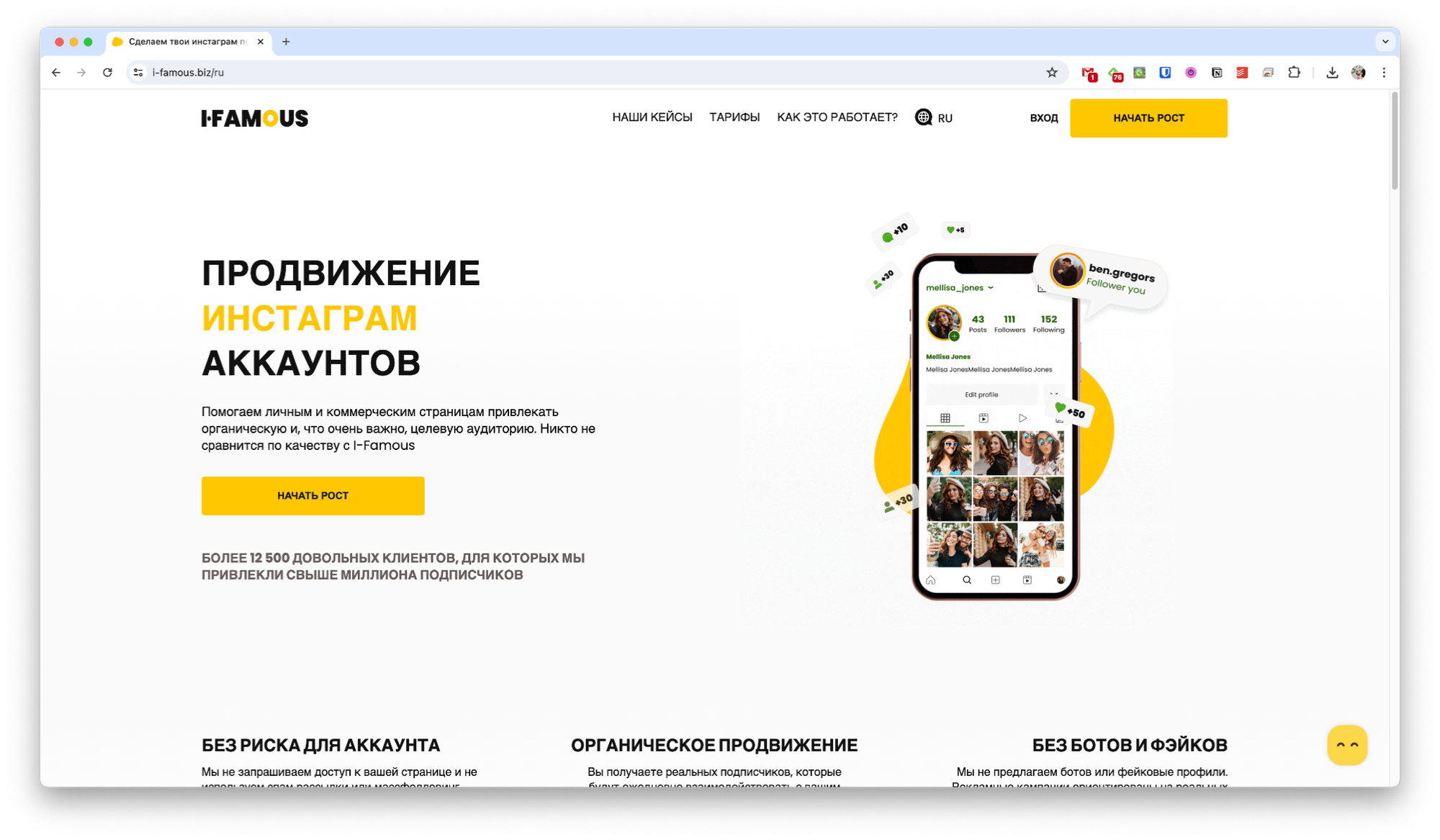 Особенность сервиса — целевая ориентированность набора подписчиков. I-Famous применяет для продвижения не стандартный цифровой алгоритм, а искусственный интеллект. Тот анализирует аккаунт заказчика, сравнивает со страницами конкурентов. Начинает искать подходящую аудиторию. Благодаря такому алгоритму I-Famous подбирает подписчиков для вашей страницы быстро, что ценят кооперативные заказчики.