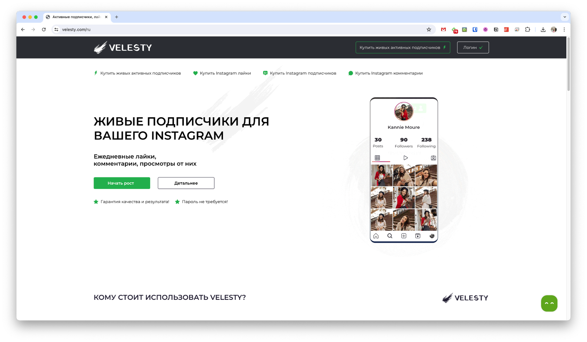 Этот сервис тоже работает по «чистой» схеме привлечения, ориентирован на реальных подписчиков, не ботов. Приоритеты Velesty — естественный рост аудитории, оптимизация статистики аккаунта, повышение его видимости. Вовлечённость подписчиков повышает охват, обеспечивает попадание в рекомендации Instagram. Особое внимание сервис уделяет представителям брендов и известным персонам, которые стремятся максимально повысить свою значимость в социальной сети.