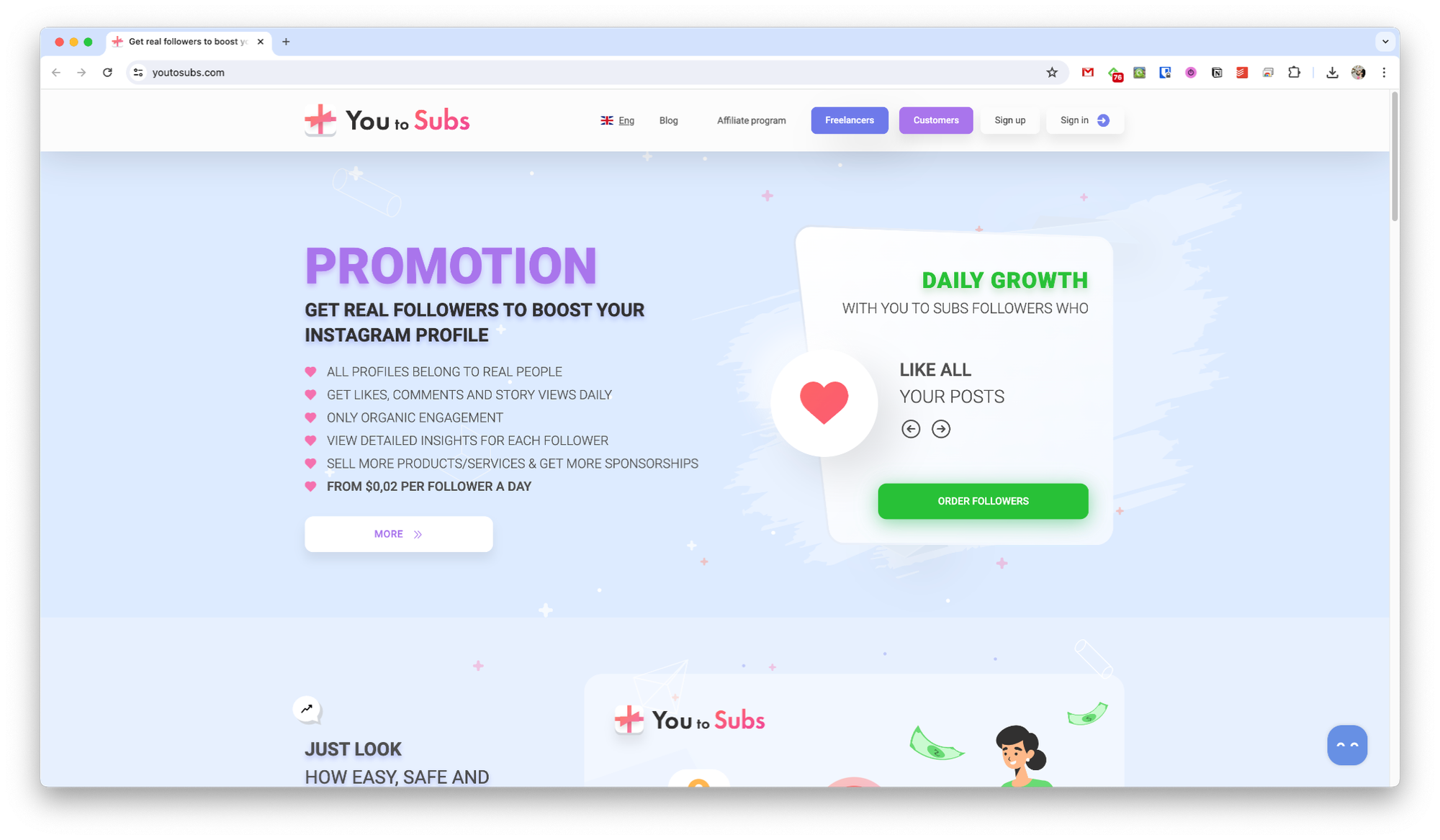 Новым заказчикам сервис You to Subs предоставляет тестовый 5-дневный период. Благодаря чему первые 50 подписчиков обходятся бесплатно. Предусмотрена партнёрская программа, позволяющая получать 5% от прибыли заказчиков и исполнителей.