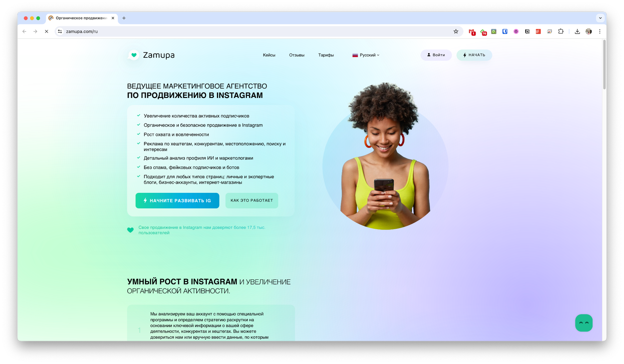 Это маркетинговое агентство тоже пользуется искусственным интеллектом для продвижения страниц в Instagram. Проанализировав аккаунт, система выбирает оптимальные способы продвижения, делает выборку по конкурентам, локации, хештегам, аудитории. На вашу страницу будут подписываться реальные люди, подходящие по региону проживания, языку, тематической заинтересованности. Благодаря естественному продвижению опасаться бана не придётся.