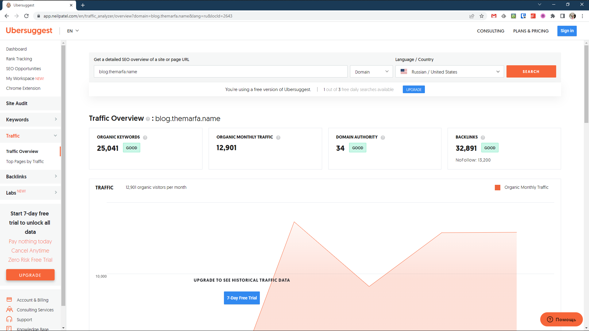 Сервис создан Нилом Пателем (Neil Patel) — человеком, хорошо известным среди маркетологов. Ubersuggest работает аналогично сервисам выше: показывает месячные данные о посетителях, органических ключевых словах и прочей полезной информации. Данные доступны от месяца до года.