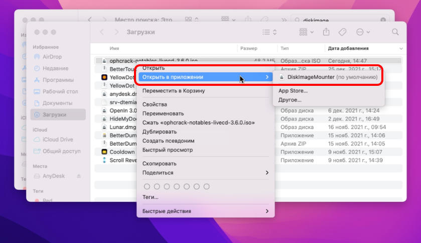 Просто нажмите правой кнопкой на ISO-файле и выберите пункт Открыть в приложении > DiskImageMounter. Свежеподключённый диск вы сможете найти на рабочем столе.