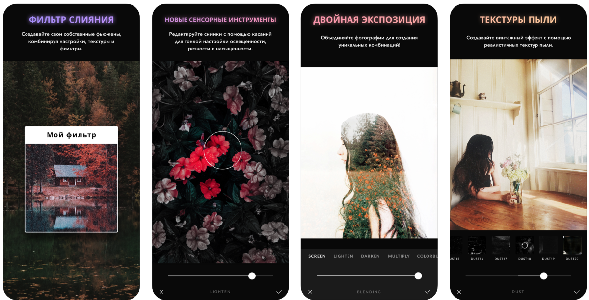 Есть в Afterlight 2 и функции, полезные для типографов, например, наложение на фотоснимки надписей. В завершение стоит упомянуть об инструменте для создания эффекта двойной экспозиции, который может сделать ваши фотографии действительно уникальными.