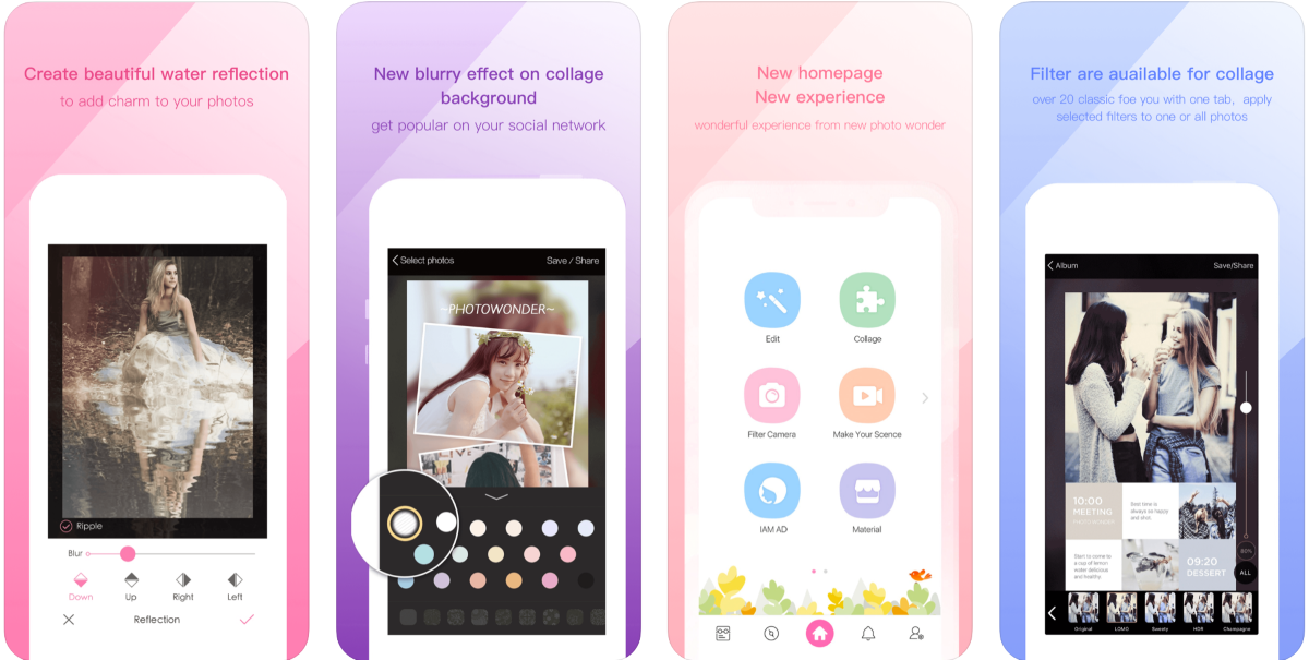 Превосходный пользовательский интерфейс делает PhotoWonder одним из самых быстрых и удобных приложений для обработки фотографий на смартфонах. В этом приложении также имеется хорошая функция коллажа с несколькими макетами и эффектами фотостудии. Выбор фильтров невелик, но многие из них настолько хорошо спроектированы, что вы найдёте их гораздо более ценными, чем просто большое количество фильтров в других приложениях. Например, фильтр «Vintage» творит волшебство с фотографиями зданий или пейзажей, а сочетание его с фильтром «Sweety» позволит создать мечтательный ретро-эффект.