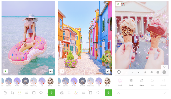 Изящная и простая в использовании LINE Camera поставляется с широким ассортиментом фильтров, рамок, значков и штампов. При желании вы можете добавить текст к своим изображениям в более чем 100 шрифтах и 20 цветах, что делает это бесплатное приложение для смартфонов одним из лучших для решения типографских задач. В разделе Stamp > Heart Symbol > Shine вы найдёте хороший выбор кистей.