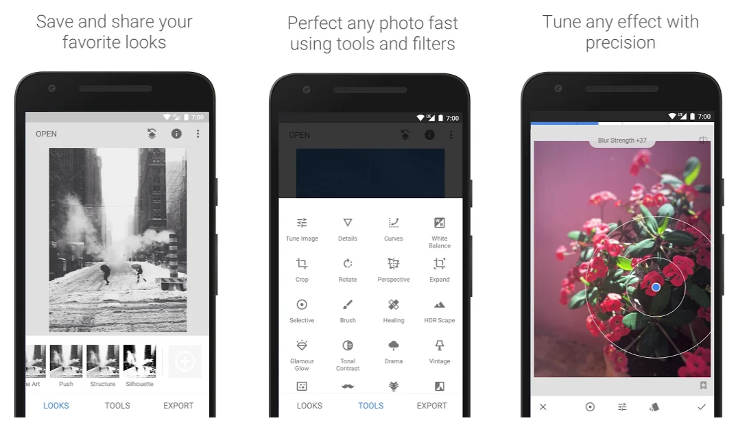 Имея такой мощный инструмент от Google, как Snapseed, составляющий достойную конкуренцию многим другим фоторедакторам, желать чего-то большего даже не приходится. Это впечатляющее приложение обладает 29 инструментами и фильтрами, с его помощью можно открывать JPG- и RAW-файлы. Snapseed позволяет пользователям сохранять личные настройки и применять их для будущих работ.