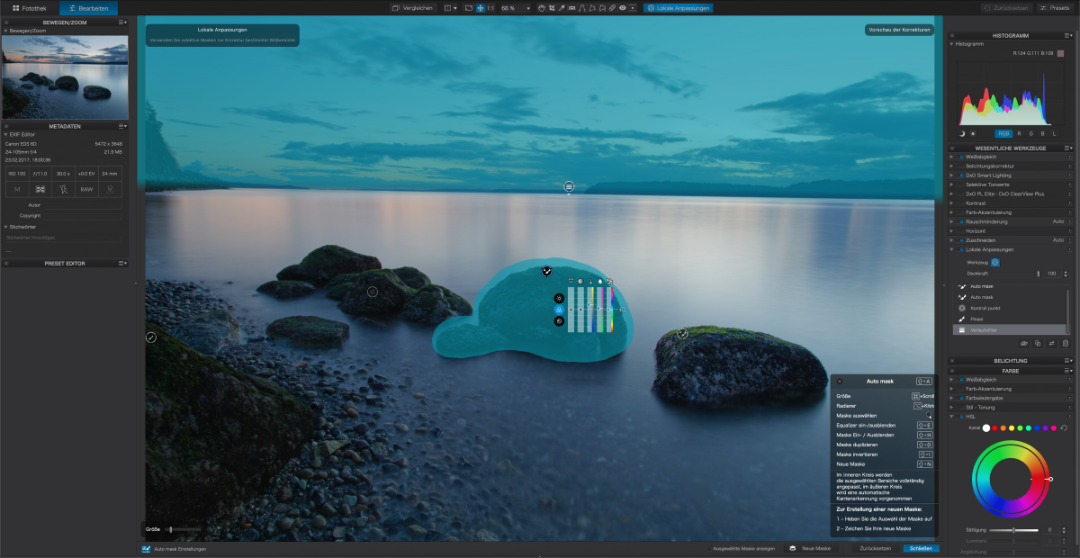 DxO PhotoLab автоматически компенсирует различные степени искажения, хроматические аберрации, мягкость краёв и виньетирование, характерные практически для всех объективов цифровых камер.