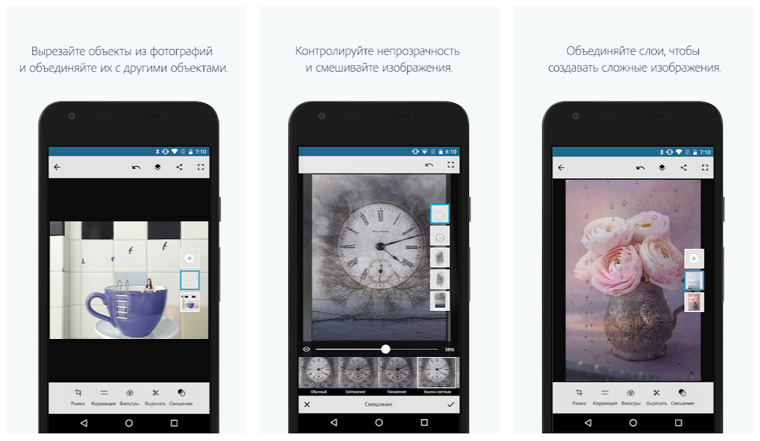 Photoshop Mix — это приложение, которое больше подходит для тех, кто хочет сделать громкое заявление, чем для тех, кто просто вносит незначительные изменения. PS Mix позволяет вырезать и комбинировать элементы из разных изображений, смешивать слои и вносить коррективы в ваши творения. И что немаловажно, приложение это очень просто в использовании.