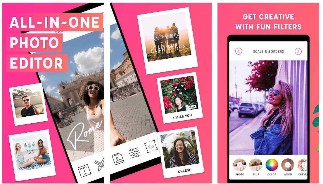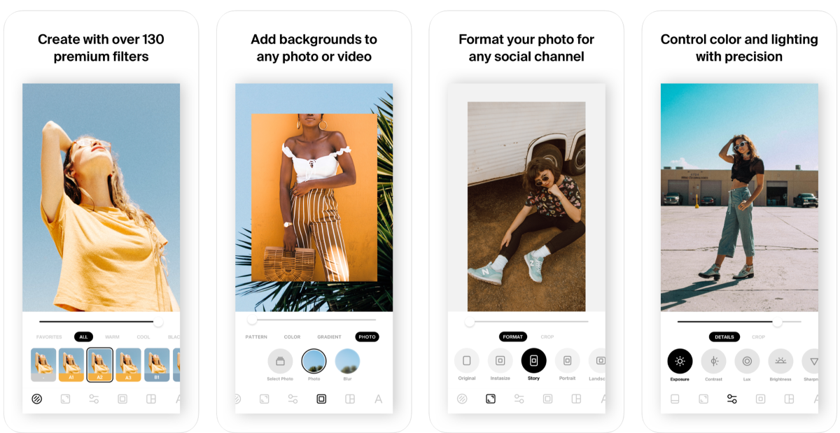 Instasize редактор для фото и видео, доступный на обеих мобильных платформах. В нём есть фильтры на основе профессиональной пленки, креативные наклейки и границы, ретушь и уникальные рамки для коллажей.
