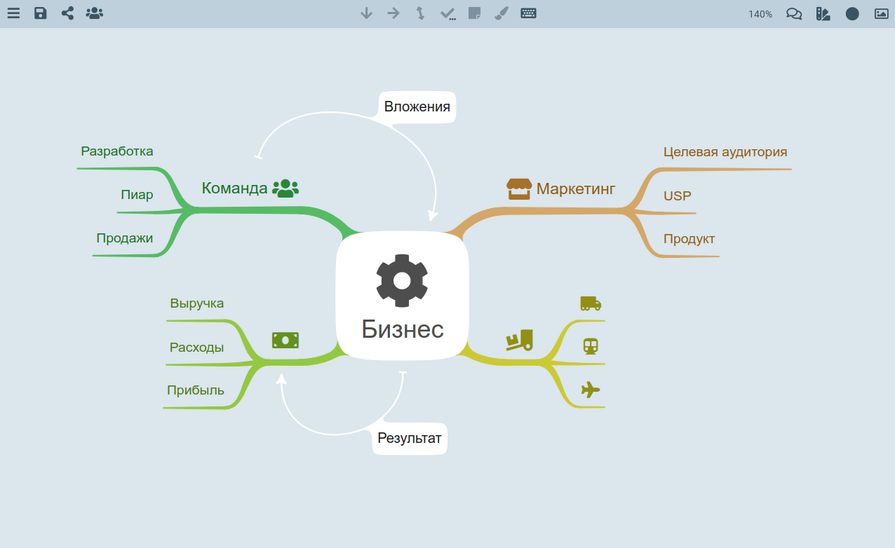 MindMeister — самый «мускулистый» среди всех сервисов по интеллект-картам. Является лидером на рынке онлайн-картографии. Я специально поставил его в самый верх, потому что MindMeister — пример сервиса почти со всеми функциями майндмэпов. В дальнейших описаниях буду опираться на перечисленные тут возможности. А именно: интуитивно понятный редактор схем для любых идей, функция проведения мозговых штурмов в реальном времени между неограниченным числом пользователей, планирования проектов. Пользователи могут выбирать между классическим макетом и режимом оргструктуры. Есть возможность экспортировать в MS Word, PowerPoint, PDF, PNG и другие форматы.