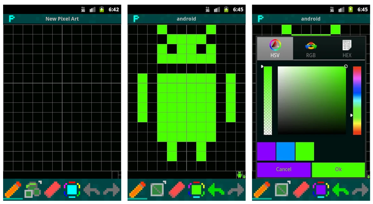 Pixelesque — один из лучших инструментов для работы с пиксель-артом на Android. Простой и понятный интерфейс поможет быстро создать нужный арт. Есть зум, drag'n'drop, необходимые инструменты для редактирования, пипетка, история, возможность поделиться результатом с друзьями и многое другое.