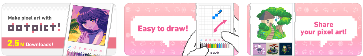 Dotpict — простой инструмент для создания пиксель-арта, который оптимизирован для тач-скрина. Кисть не перекрывается пальцем, есть автосейв, шеринг, зум и включение/выключение сетки.