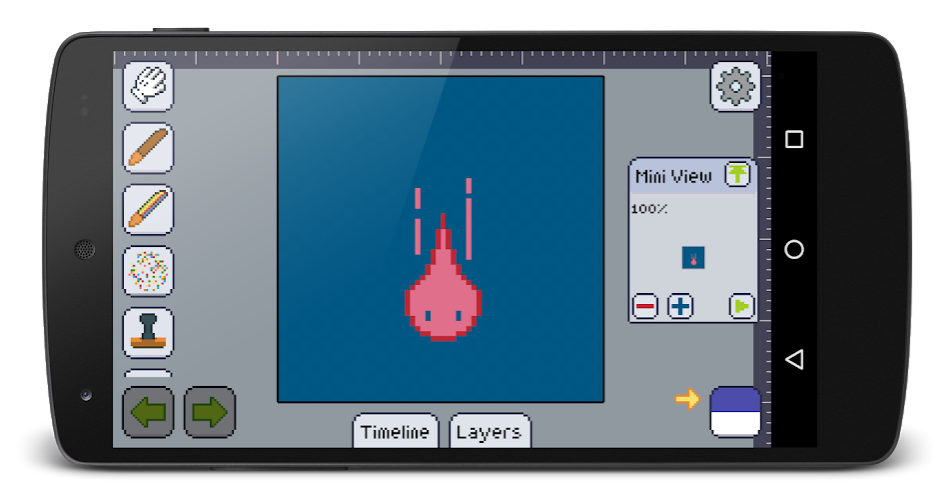 Благодаря инструментам Pixel Studio можно работать с примитивами и градиентами, использовать различные встроенные и пользовательские кисти, скачивать спрайты из библиотеки. Есть поддержка бесшовных текстур, симметричное рисование, неограниченный размер холста и многое другое.
