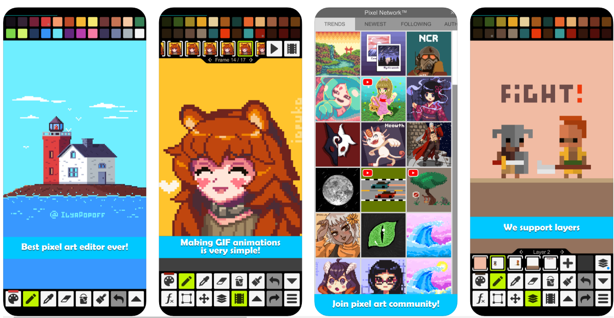 Aseprite — популярная программа для создания пиксель-арта и анимированных спрайтов. К сожалению, она доступна только на десктопах. На мобильных устройствах вам понадобится одна из нижеприведённых альтернатив.