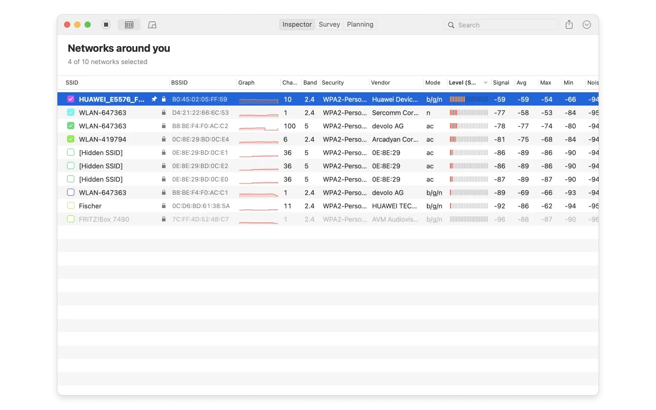 NetSpot автоматически сканирует все доступные сети и предоставляет данные по ним в режиме реального времени. Вы сможете узнать данные о наличии брешей в безопасности, силе сигнала, скорости, проблемах в настройке, утечках, стабильности и многом-многом другом. Всю информацию можно экспортировать в PDF или CSV.