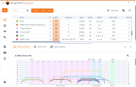 Один из лучших анализаторов Wi-Fi в этой статье, потому что он позволяет решить нашу задачу в очень понятном интерфейсе. Даже если вы никогда не пользовались ничем подобным, вы легко разберётесь, что к чему.
